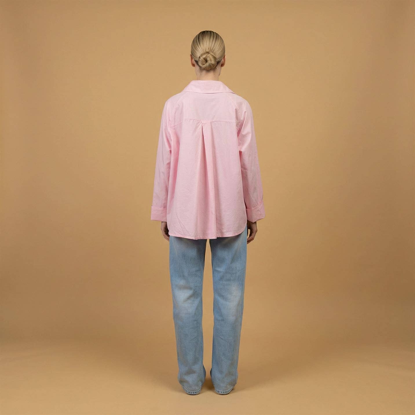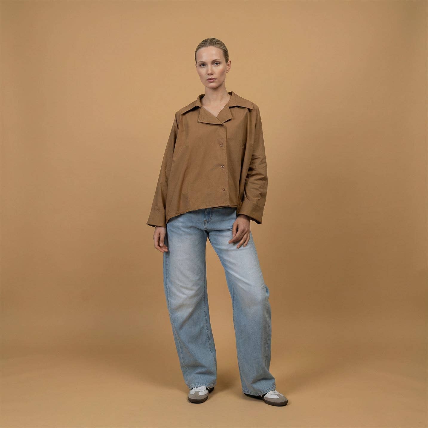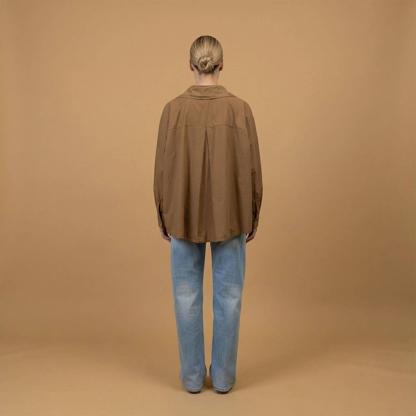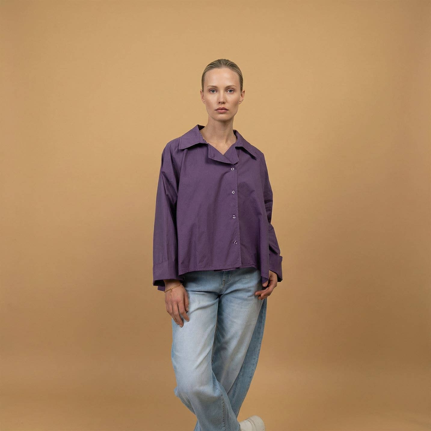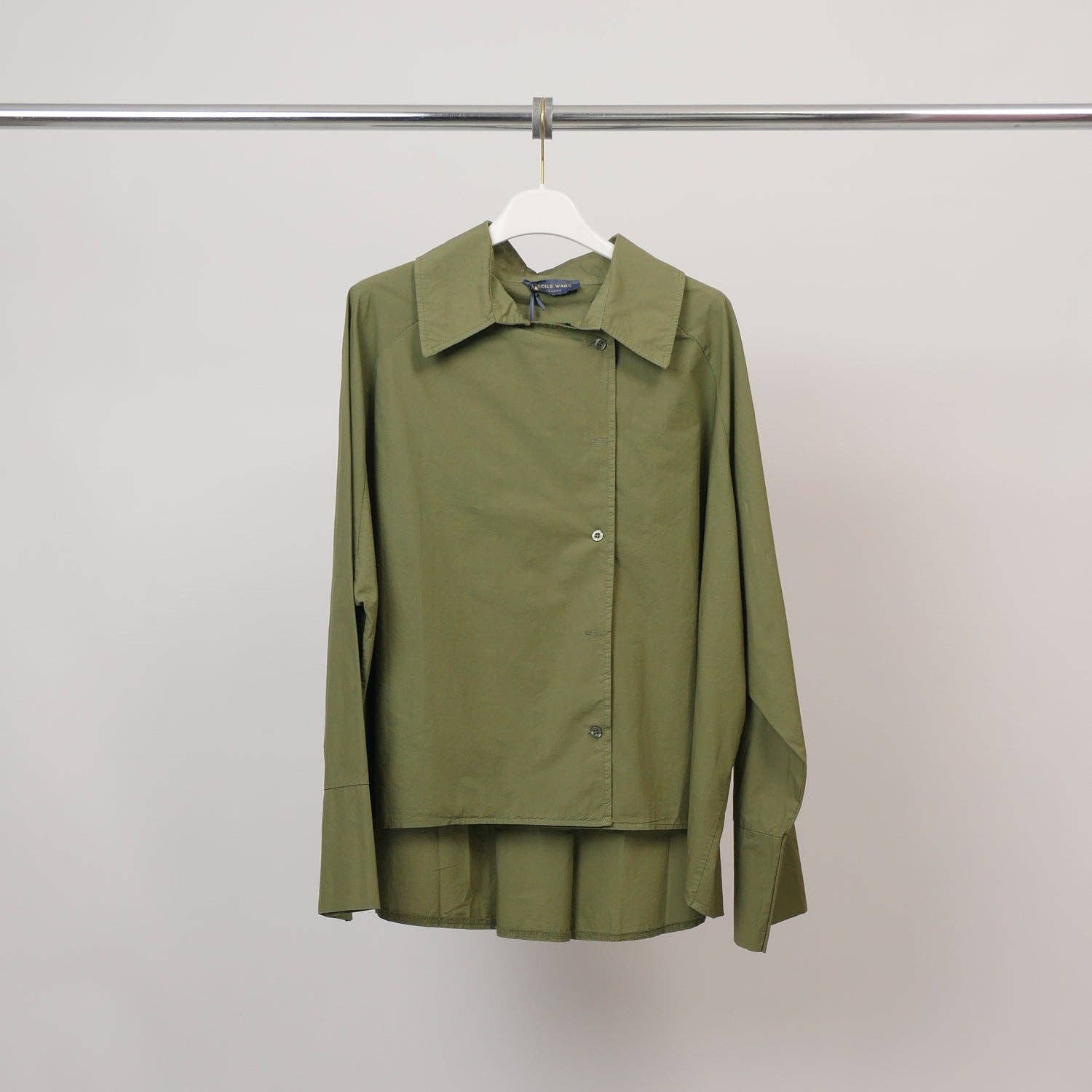 Son col pointu structuré et ses manches longues aux poignets boutonnés renforcent son allure graphique, tandis que sa coupe ample et son ourlet légèrement plus long au dos assurent confort et liberté de mouvement.