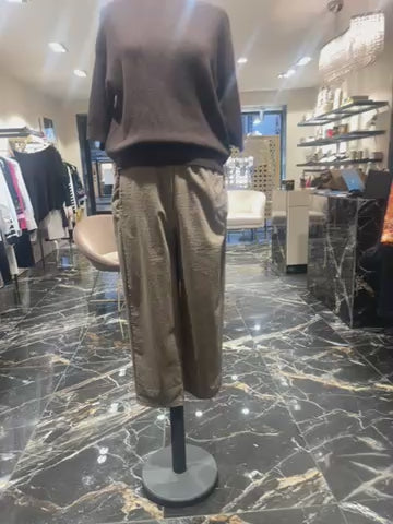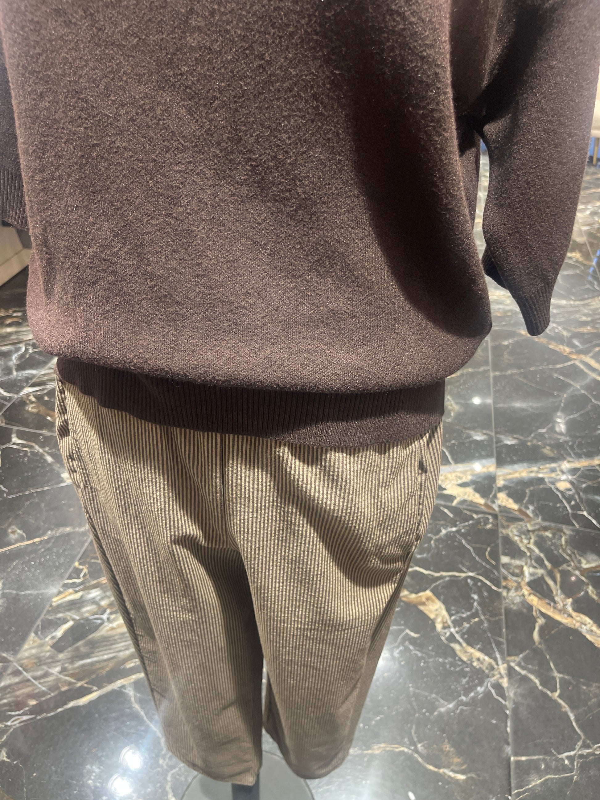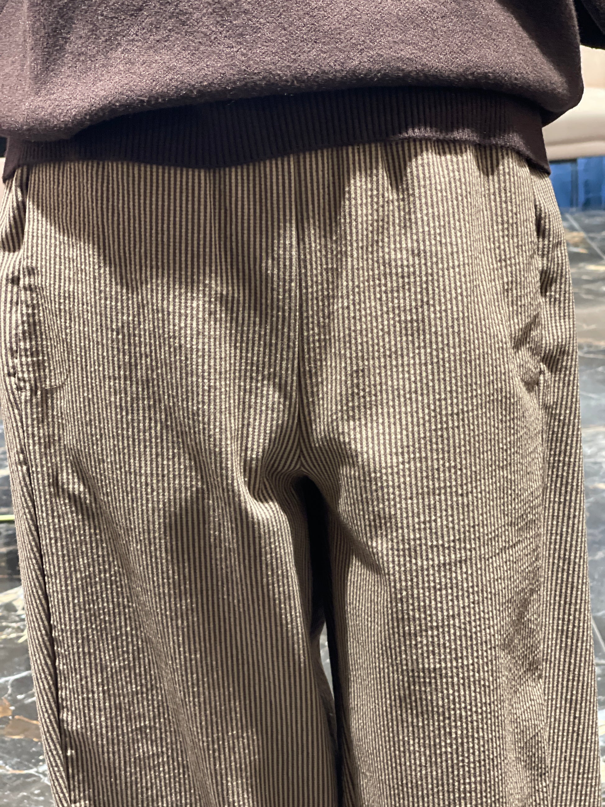 Pantalon à rayure beige et chocolat.