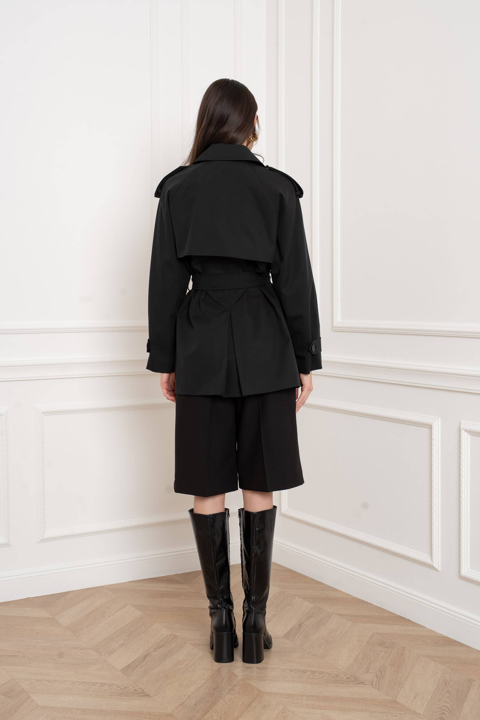 Trench mi-long contemporain et féminin. Doté d'un col large, d'un double boutonnage et de détails inspirés du trench classique, il est rehaussé d'une ceinture à boucle qui marque délicatement la taille. Sa coupe nette et sa longueur raccourcie apportent modernité et élégance.